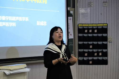 接下来,他从社会资源、师资建设、教材编写、国际协作、实验室器材等多个角度,分析了我校超声方向班目前所拥有的教学优势,以“掌上超声”及POC超声教学论坛为引,展现便携式超声依托5G网络技术,织起的远程超声网络体系。彭成忠主任表示,近年来超声医学的发展迅速,目前我校的超声医学的发展也走在国内前沿,并且在一定程度上已获得国际认可。同时,他将放射医学和超声医学的课程设置、未来工作领域进行比对,使各位同学能依照自己的未来规划与就业需求,更好地选择适合自身的专业方向。