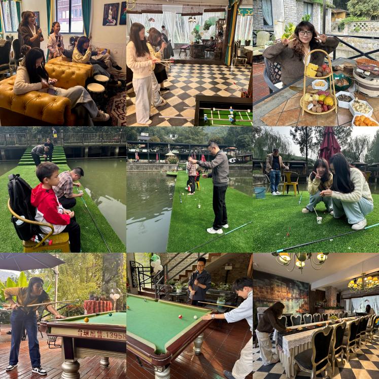 置身于远离尘嚣的青山茶园之间,老师们暂别平日忙碌的工作,尽情享受秋日的惬意。活动现场氛围轻松热烈:垂钓区旁,他们耐心沉稳,享受宁静时光;台球桌上,巧思妙打,尽显活力;K歌房中,歌声悠扬,掌声不断;桌游桌旁,谈笑风生,其乐融融。